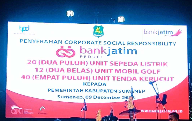Di hari yang sama, juga berlangsung penyerahan CSR di Sumenep. Bantuan CSR yang diberikan kepada Pemerintah Kabupaten Sumenep yaitu 20 unit kendaraan listrik, 12 unit mobil golf, dan 40 unit tenda UMKM. Penyerahan dilakukan secara simbolis oleh Direktur Manajemen Risiko bank Jatim Eko Susetyono kepada Bupati Sumenep Achmad Fauzi pada Sabtu malam (9/12/2023).